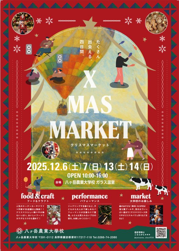 『八ヶ岳農業大学校クリスマスマーケット』4日間で合計約50店が集う冬のマルシェイベントが開催!ステージパフォーマンスや気球体験も。