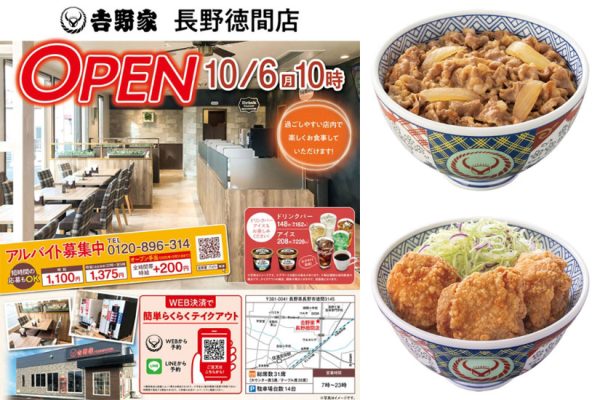 長野県長野市に新店舗「吉野家 長野徳間店」が2025年10月6日(月)午前10時にオープン。定番の「牛丼」や「から揚げ丼」をはじめ、期間限定メニューなども登場。イートイン・テイクアウトどちらも対応で、ドライブスルーやWe … 続きを読む 10/6(月)オープン「吉野家 長野徳間店」開店キャンペーンでお得なクーポンを配布!イートイン&テイクアウトで牛丼などを堪能@長野県長野市