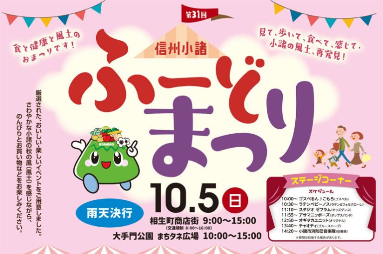 2025年10月5日(日)に長野県小諸市で、JR小諸駅前を歩行者天国とし、「相生町商店街」「大手門公園まちタネ広場」など複数の会場で『第31回 信州小諸ふーどまつり』が開催。 今年も、各エリアにご当地グルメのこもろん味噌 … 続きを読む 10/5(日)小諸の秋を彩る食の祭典『第31回信州小諸ふーどまつり』 小諸駅一帯でイベント開催!骨董・蚤の市/農産物販売の軽トラック市/病院祭も同時開催@長野県小諸市