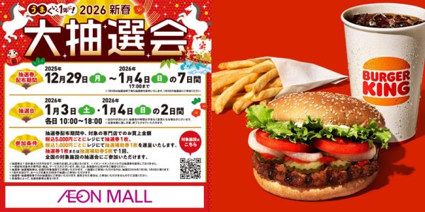 年末年始のイオンモール松本に注目!。人気ハンバーガーチェーン「バーガーキング®︎」の新規オープンをはじめ、店内の専門店での買い物・飲食共通券が最大で1万円分当たる「2026新春大抽選会」や人気飲食店の食事券・焼き菓子・オ … 続きを読む 「バーガーキング®︎」オープンのほか大抽選会、グルメ福袋も販売!「イオンモール松本」は年末年始のNews&イベントが盛り沢山!!