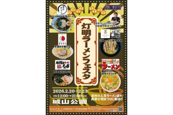 2026年2月20日(金)から2月23日(月・祝)に、長野県長野市にある「城山公園」で『灯明ラーメンフェスタ』が『第23回長野灯明まつり』のオフィシャルイベントのひとつとして開催。同イベントは、信州ラーメン界のカリスマ・ … 続きを読む 2/20(金)~2/23(月・祝)『灯明ラーメンフェスタ』信州ラーメン界のカリスマがプロデュース!幻想的な灯明まつりで熱々ラーメンを堪能@長野県長野市