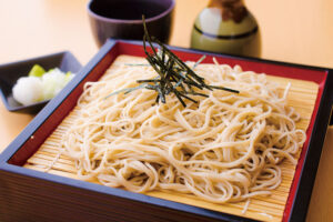 1分ほどでさっと茹でる蕎麦は茹でたあとに冷水でしめ、富士山盛りに。