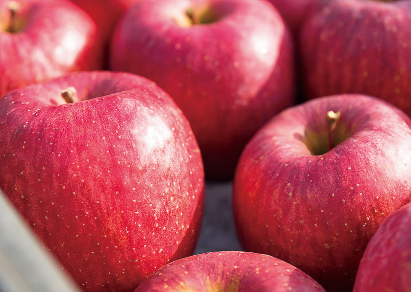 艶やかな赤にも魅了される「サンふじ」。素質の良い枝から作られた花芽に実らせることにより完熟したおいしいりんごに仕上がります。