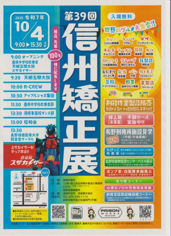 『信州矯正展』世界のグルメ・長野刑務所施設見学・マル獄製品などの販売・婦人靴半額セールなど。