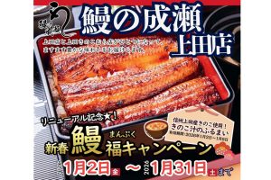 【クーポン付き】2026/1/2(金)~1/31(土)上田市内の「鰻の成瀬」で『リニューアル記念!新春鰻まん福キャンペーン』が開催。うな重各種が割引&地元産を使ったきのこ汁のふるまいも@長野県上田市