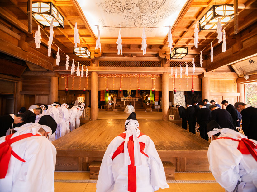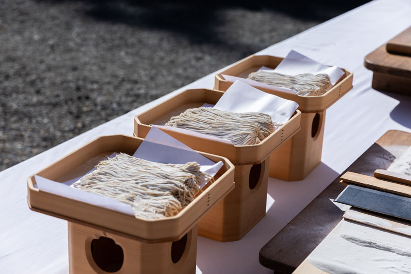 白装束に身を包んだそば職人が、「謹製 そば切り」や「戸隠おろし」などの新そばや地元特産品を戸隠神社の御祭神に献上する儀式。