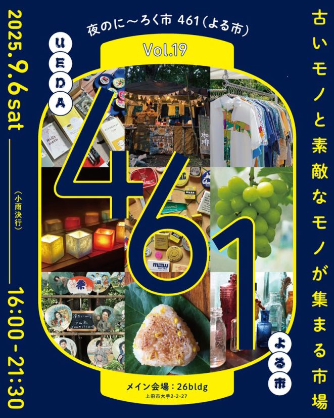 長野県上田市の上田駅近くで、ノスタルジックな裏通りで古いモノや素敵なモノが集まる夜の市場『461(よるいち)」が、2025年9月6日(土)に開催。