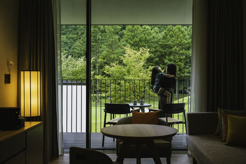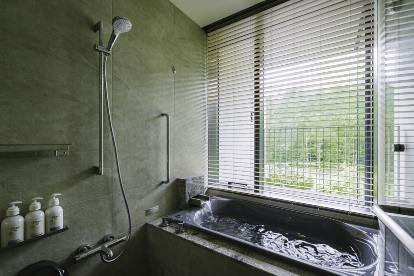 清々しい朝の光に包まれる自分だけのバスタイムは最高の贅沢。もちろん、夕暮れに染まる山々を眺めたり、夜には満天の星空に癒されたり——それぞれの時間帯に魅力があり、それを自分の好きな時間に好きなように体験できるというのは、部屋付きのバスルームならではの特別な時間。