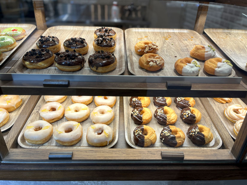 2年かけて独自開発したというイーストドーナツは、驚くほどにふわっと軽く、もっちり食感。オリジナルグレーズをはじめ、レモンやベリー、アールグレイなどの素材にこだわったグレーズ系と、自家製カスタード入りのクリーム系ドーナツを味わえます。