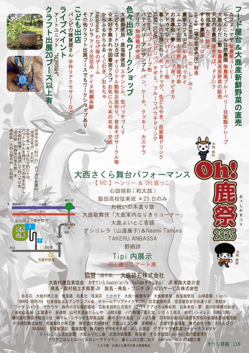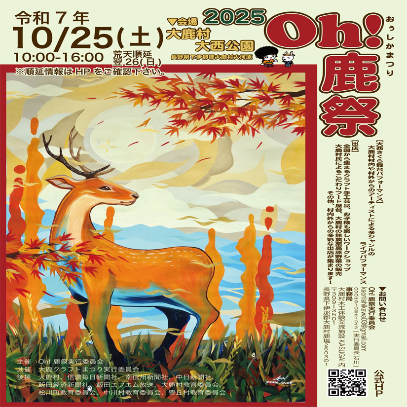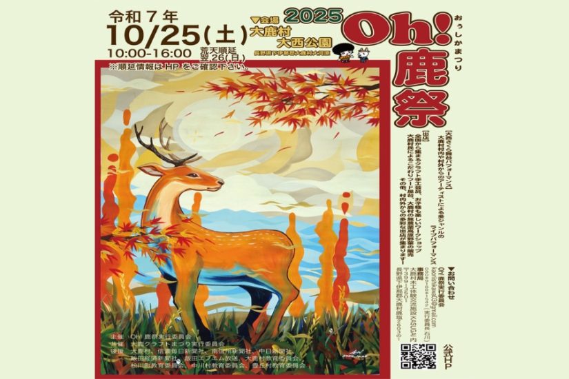 2025年10月25日(土)に、長野県大鹿村の「大西公園」にて、『Oh!鹿祭2025』(オー!しかまつり)が開催。今回で4回目となる同イベント。公園内の芝生広場では、20以上のクラフト店が出展するほか、焼きそばやたこ焼き、チュロス、無農薬ブルーベリーを使ったクレープなど、こだわりのフードや大鹿村で栽培された新鮮な野菜が販売されます。さらに、缶バッチづくりやアイヌの伝統的な刺繍体験など親子で楽しめるワークショップも。