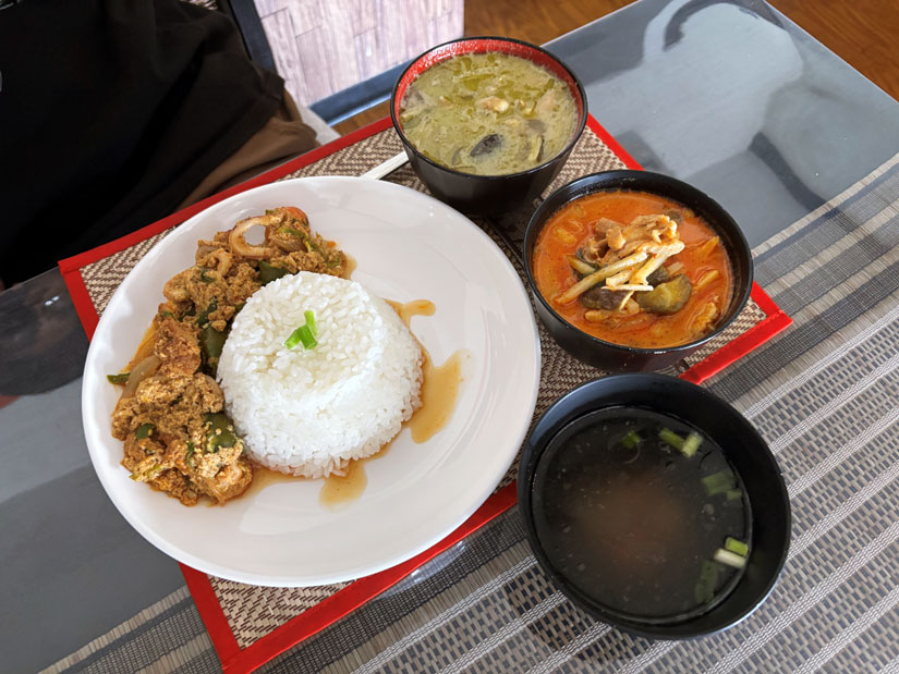 そして、「プレートランチ」がこちら!グリーンカレー・レッドカレー・シーフードパッポンカレー・ガパオ・鶏肉のしょうが炒めの全5種類の中から、2種類または3種類を選べます(2種類の場合850円、3種類の場合1,050円)。もちろん、ゆうさんは3種類をチョイス!