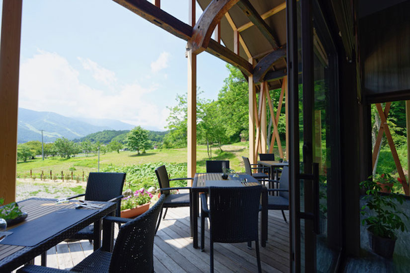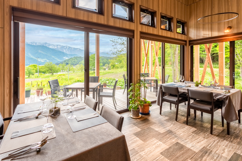 店内に一歩足を踏み入れると、大きな窓から見える白馬の山々が目に飛び込んできます。窓際のテーブルからは、食材が育つ田畑までも見渡せる絶景が広がっています。その景色を眺めながら、季節の恵みを存分に味わう贅沢なひとときが待っています。