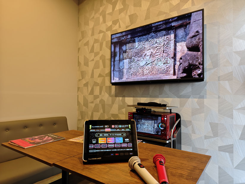 コンパクトながらしっかりと防音対応された店内。設備は「LIVE DAM AiR」。最新の楽曲から昔懐かしい名曲まで幅広く楽しむことができます。