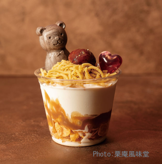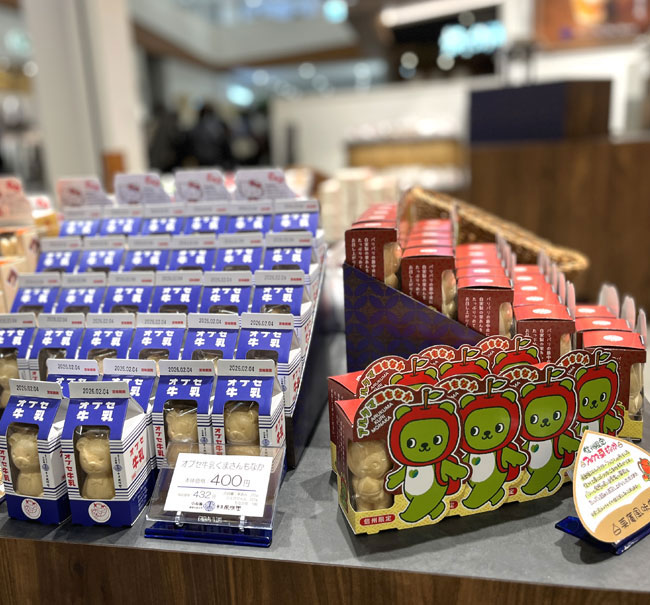 小布施の「栗庵風味堂」。かわいい栗スイーツ(画像左)や「くまさんもなか」(画像右)など、さまざまな栗菓子がそろいます。