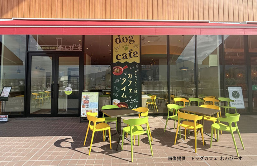南側2階テラスにワンちゃんと利用できる「ドッグカフェ わんぴーす」。