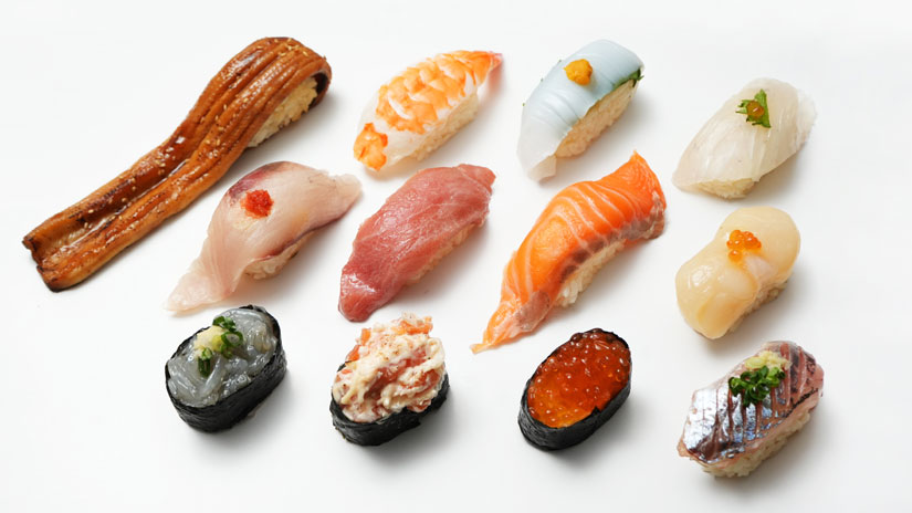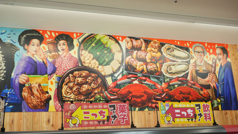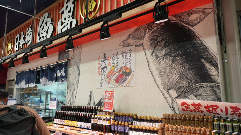 鮮魚部門「日本橋 魚萬」。名物商品のアトランティックサーモンや、赤身、中トロ、大トロが楽しめる「鮪ブーメラン」などを用意。鮮魚コーナーは圧巻の品ぞろえで、まるで市場にいるような迫力が体感できますよ。