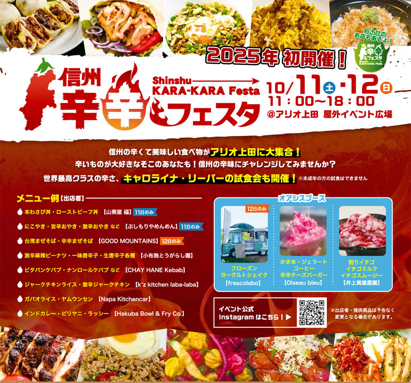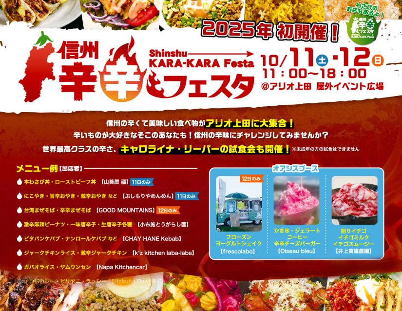 2025年10月11日(土)、12日(日)の2日間、アリオ上田屋外イベント広場にて『信州辛辛フェスタ』が開催されます。信州の辛くて美味しい食べ物が大集合!辛いものが大好きなそこのあなたも!信州の辛味にチャレンジしてみませんか?世界最高クラスの辛さを誇る、キャロライナ・リーパーの試食会も開催します。