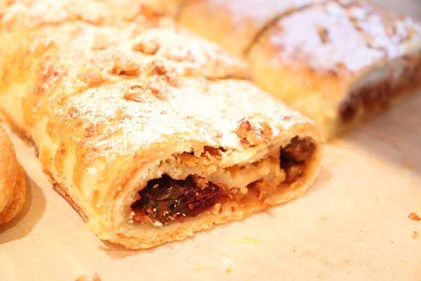 ながーい見た目の「シュトゥルーデル」(1カット400円)は、すりおろしたリンゴやアーモンド、クルミ、レーズン、シナモンをぎっしりと詰め込んだチェコのアップルパイ。それぞれの素材が重なり合い、絶妙なハーモニーが楽しめます。