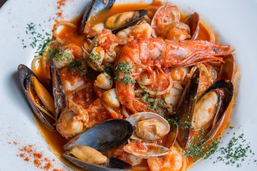 海の幸をたっぷりと使った贅沢パスタ。ぷりっと弾力のある2種類の海老をはじめ、小柱やムール貝、あさりがたっぷり。手づくりのトマトソースにもその風味がしっかりと溶け込み、太めのパスタ麺と絶妙にからみ合うことで、食べ応えも抜群。