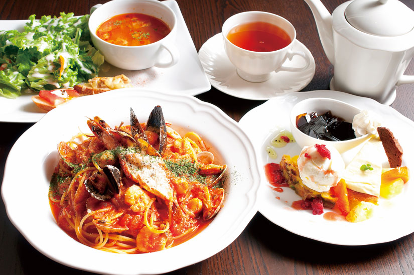 多彩なメニューが、「LaPACE」の魅力の一つ。ランチからディナーまで楽しめるメニューは、なんとパスタ55種・ピザ33種! イタリアから直輸入した生ハムやチーズを使ったこだわりの一皿は、どれも本格的な味わい。さらに、手作りドルチェなど、心ときめくカフェメニューや季節限定メニューも充実。来る度に違う味に出逢えますよ。