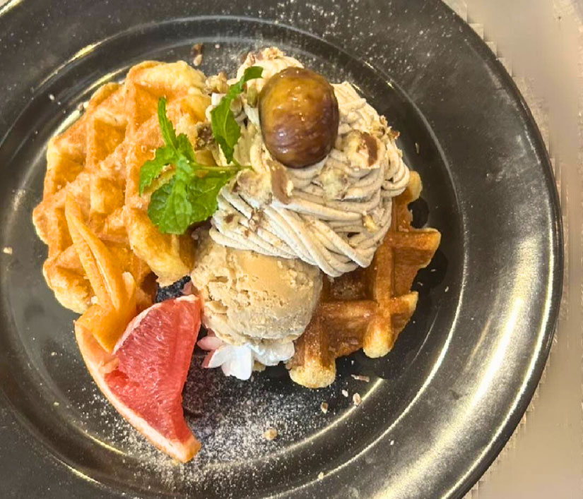 季節限定のデザートも魅力。取材時は秋の味覚、栗を使った「モンブランのワッフル」が登場。
