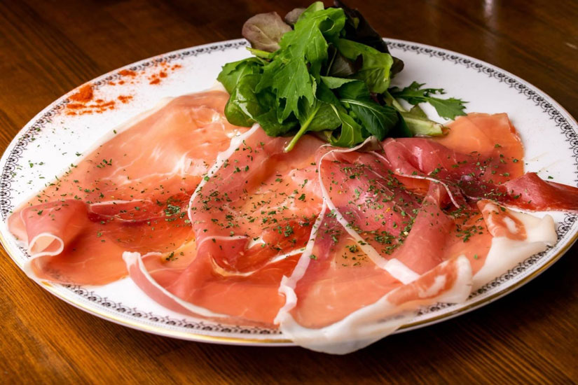 世界三大ハムの一つとして有名なイタリアのパルマ地方でつくられた「パルマ・プロシュート」の盛り合わせ。イタリアンワインとのペアリングにも。