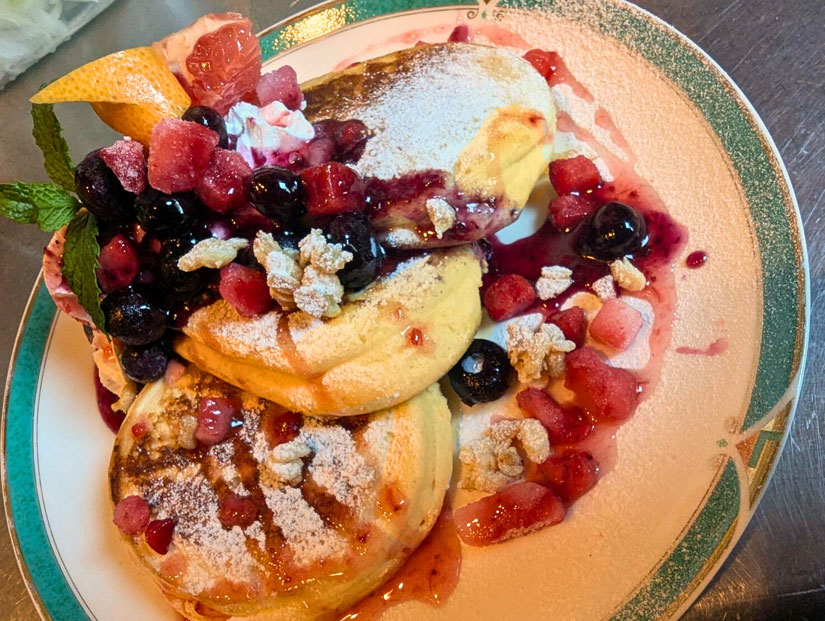 ふわふわ食感が特長のパンケーキ。ホイップクリームやフルーツ、ソースをトッピングした食感も楽しめる美味しい組み合わせ。ほかにも「ハニーパンケーキ」や「チョコレートソースのパンケーキ」も選べます。