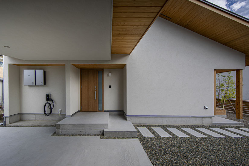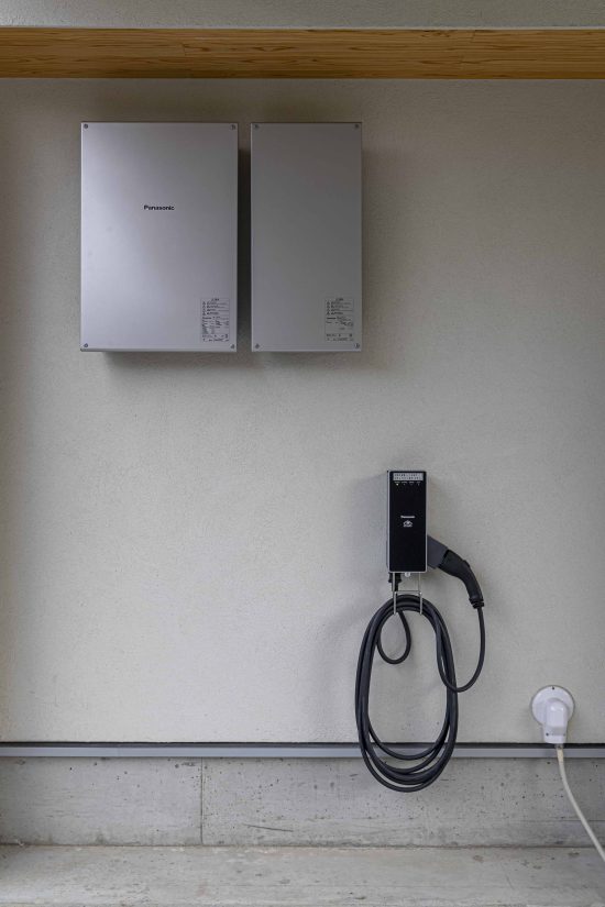 未来を見据えた設備も充実。太陽光発電パネルは6.225kWを搭載し、ガレージにはEV用充電器が、玄関収納には6.7kWの蓄電池も完備されています。将来的に「V2H」仕様にすることも可能(V2H=EV車に蓄えた電気を住居家電等に使えるシステム)。創エネ&蓄電で普段の省エネに役立つだけでなく、万が一の災害時にも備えられます。
