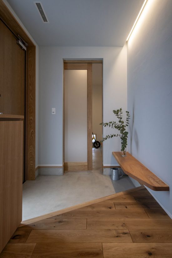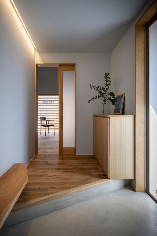 玄関ドアを開けると、動線が左右に分かれます。右手はLDKへ。左手は大きな土間収納を経て水回りへ。「水回りからはキッチンへとつながっているので、グルっと回遊できるんです。行き止まりがないのは想像以上に便利ですよ」と上原さん。