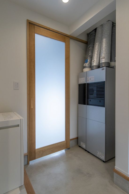 土間収納エリアには「柔光の家」の快適さを司る全館空調&換気システム「エコエアFine」が。この1台で家中の換気と空調を行い、給気口を通じて新鮮かつ快適温度の空気が各空間へ。各部屋にエアコンを設置する必要がなく、メンテもこの1台のみでOKです。