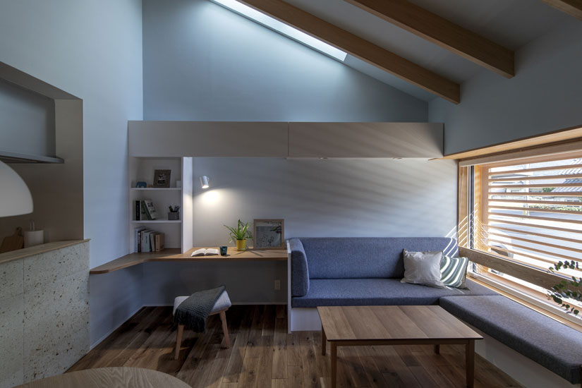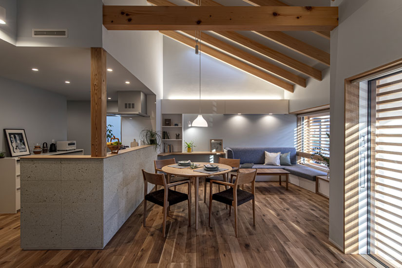 いざLDKへ!対面式のキッチンとダイニングの奥は、居心地の良さそうな造作ソファをしつらえたリビングスペース。登り梁を見せた勾配天井が木の温もりとダイナミックさを加え、そこに柔らかな光が注いでいます。ナラの無垢材、壁は塗り壁で、造作部分もほぼ無垢材。木の香りがほんのり漂うLDKは、思わず深呼吸したくなるほどの爽やかな空気に満ちています。「ナラ材は北海道産。国産材を使っているのもポイントのひとつです」。