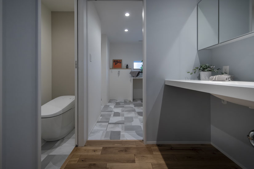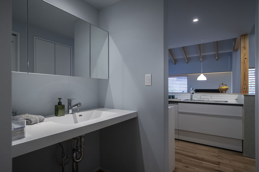 水回りはキッチン背面にぎゅっとまとめて。脱衣室の手前には収納やカウンターを備えたランドリールームがあり、洗濯家事を完結できます。「全館空調「エコエアFine」のおかげで、部屋干しもカラッと仕上がりますよ」と上原さん。キッチンから近いレイアウトは、家事の同時進行にとても便利です。