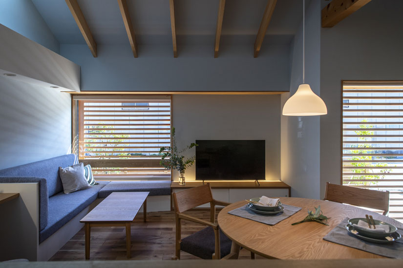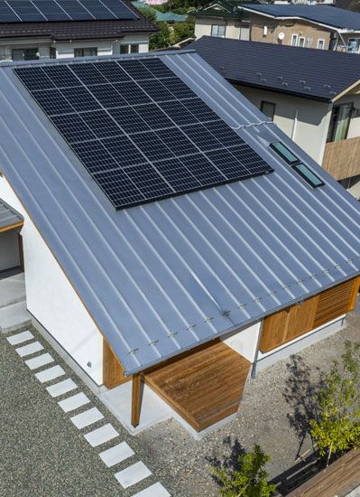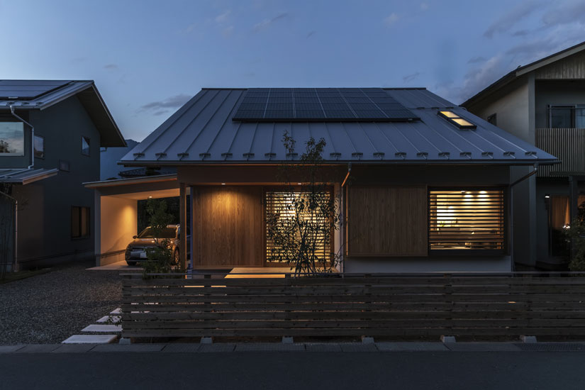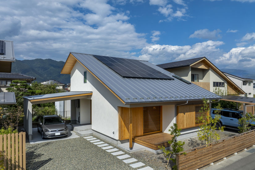 家族をおおらかに包みこむような、ゆったりとした大屋根の外観。一部に2階が乗る半平屋で、周囲に圧迫感を与えないよう高さを抑えています。南側に長く伸びる軒や開閉可能なガラリ戸は、日差しをコントロールするためのもの。「自然の恵みを活かして住環境を快適に整える、パッシブデザインが採り入れられています」と上原さん。