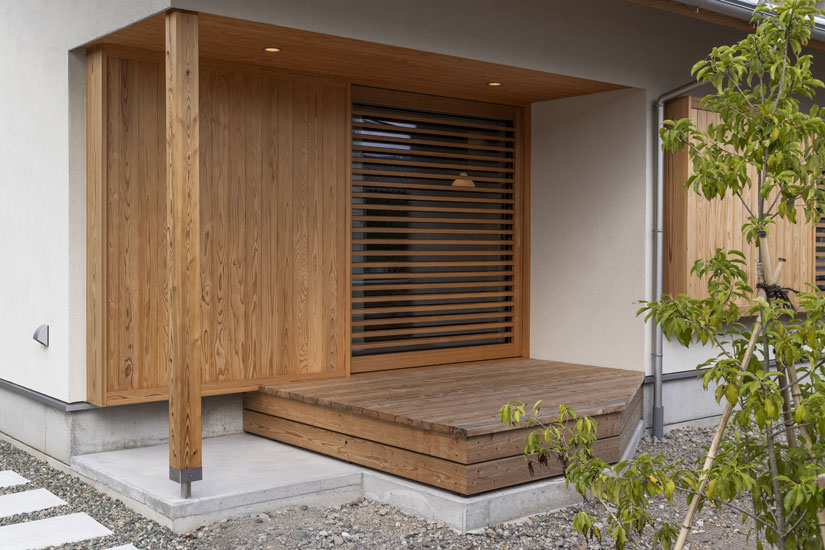 リビングの大きな掃き出し窓を開けるとウッドデッキが続いていて、内と外をゆるくつなぐバッファゾーンに。デッキ材は屋久島地杉の無垢で、油分が多いことから耐久性・耐候性に優れているのだとか。