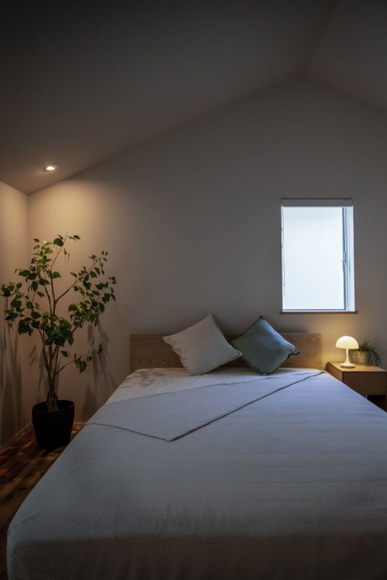 2階は全体的にコンパクトに抑えられていますが、三角の船底天井が程よい落ち着きと開放感の両方を演出。フリースペース北側は今は自由に使えるオープンエリアですが、建具をつければ個室に。ライフスタイルによってアレンジできる余白空間です。