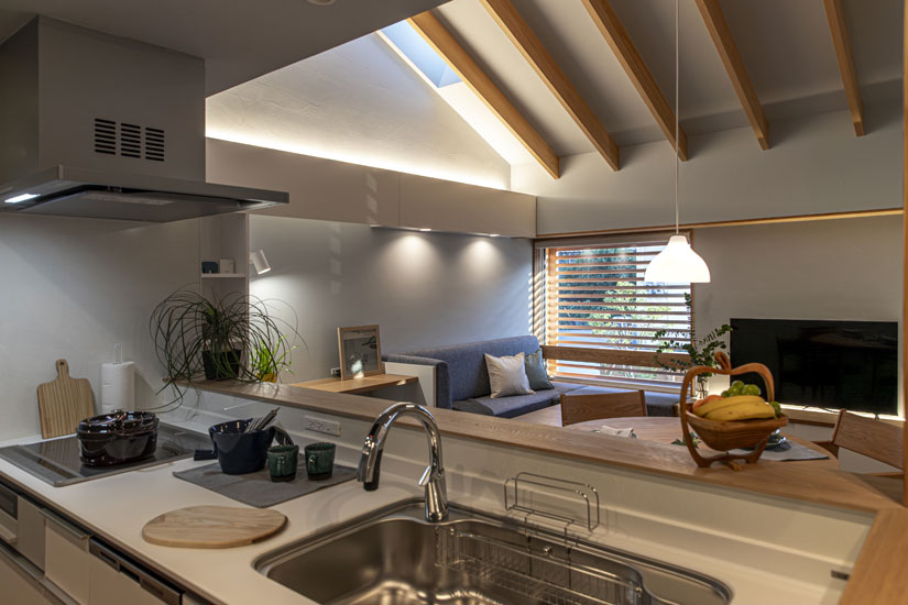 「キッチンからはLDK全体が見渡せますし、水回りはすぐ後ろ。子どもたちが2階にいても吹き抜け越しに気配が伝わってきます。どこにいても家族がつながっている感覚ですね」(上原さん)。