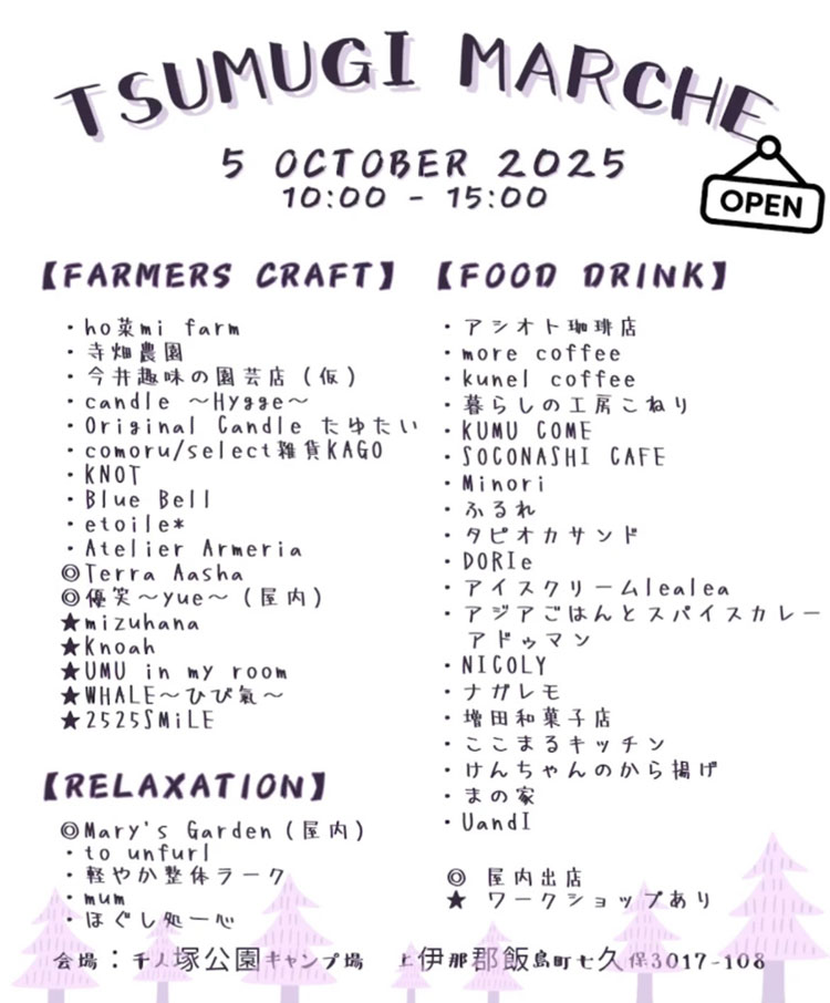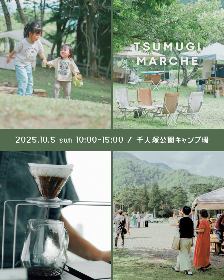 2025年10月5日(日)に、長野県上伊那郡飯島町「千人塚公園キャンプ場」で『つむぎマルシェ』が開催。毎月1回行われているマルシェで、自然豊かな野外会場に農産物販売、フード、ドリンク、リラクゼーション、クラフト作品の販売など多彩なブースが集まります。10月はハロウィンをテーマに41ブースが集結!仮装して訪れるとお菓子のプレゼントも。また、会場内には、大きなティラノサウルスが出現!中に入って遊ぶこともできます。いつもと違う装いのマルシェを楽しみましょう!