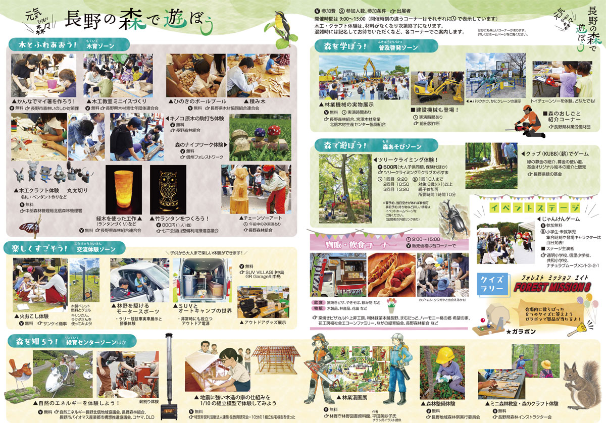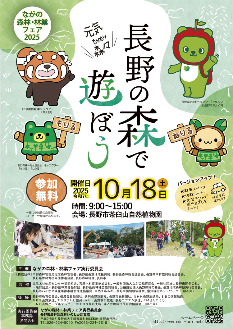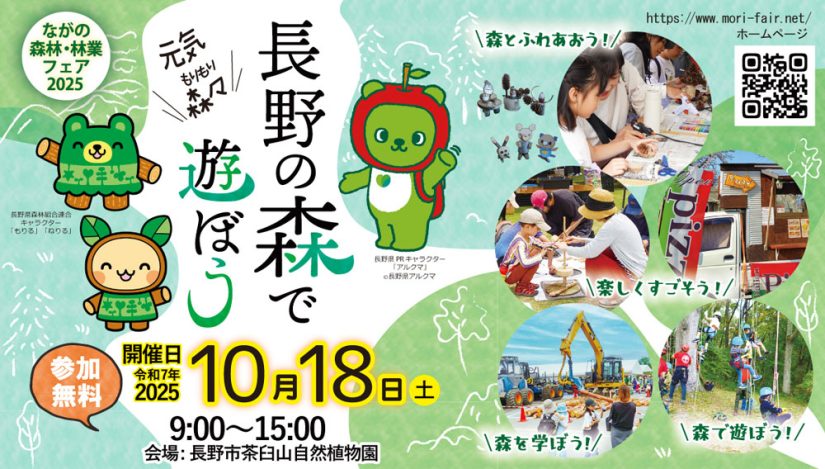 2025年10月18日(土)に長野県長野市の「茶臼山自然植物園」で『ながの森林・林業フェア2025~元気森々(もりもり)長野の森で遊ぼう~』が開催。マイ箸作り、ミニイスづくり、木工クラフトなどの木工体験や森林学習、ツリークライミングなどのアウトドア体験など多彩なプログラムを通じて森林や林業への理解を深めるイベントです。子どもから大人まで楽しめる体験コーナーや展示が盛りだくさんに用意されています。