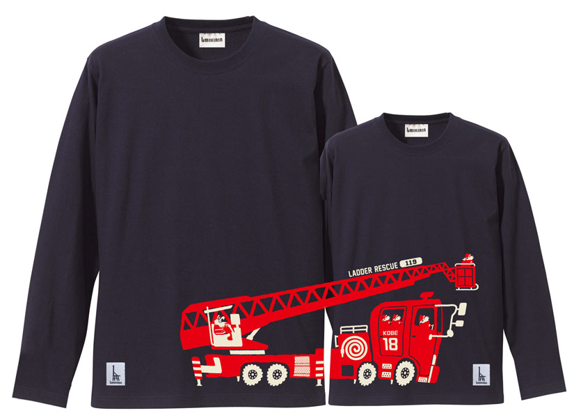 「親子でつながる長袖Tシャツ はしご車(神戸市消防局コラボ )」(サイズ90~140)こども4,290円/「親子でつながる長袖Tシャツ はしご車(神戸市消防局コラボ)」(サイズXS~XL)おとな5,390円