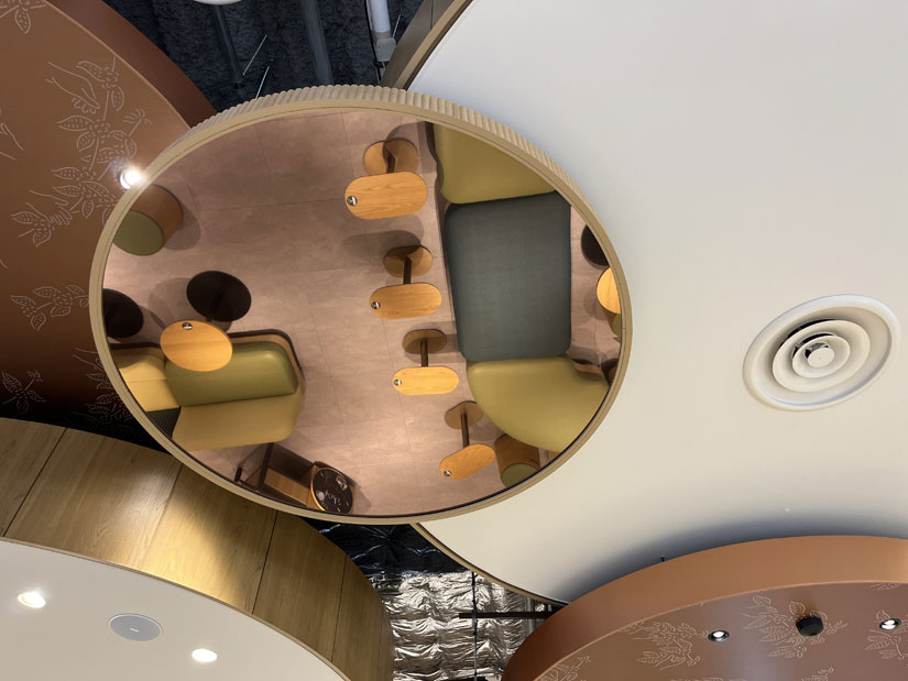 店舗の天井には遊び心いっぱいの鏡も!子どもたちの好奇心を誘います。