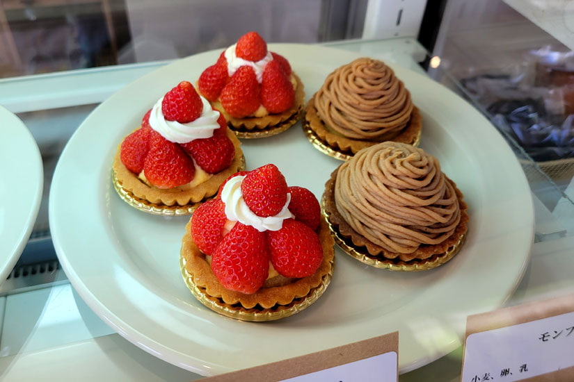 原村産の夏イチゴを使った「夏いちごのタルト」(520円)と「モンブラン」(520円)。夏イチゴの季節が終わると、秋の味覚を使ったタルトが登場する予定など、「季節の食材を使った商品も提供できればと思っています」と大学さん。