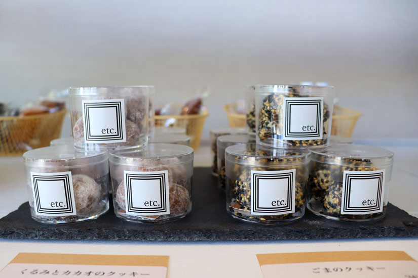 円筒のケースに入ったクッキーは、「くるみとカカオのクッキー」や「ごまのクッキー」、安曇野産ワサビがさわやかに香る「わさびとカシューナッツのクッキー」(各360円)など。