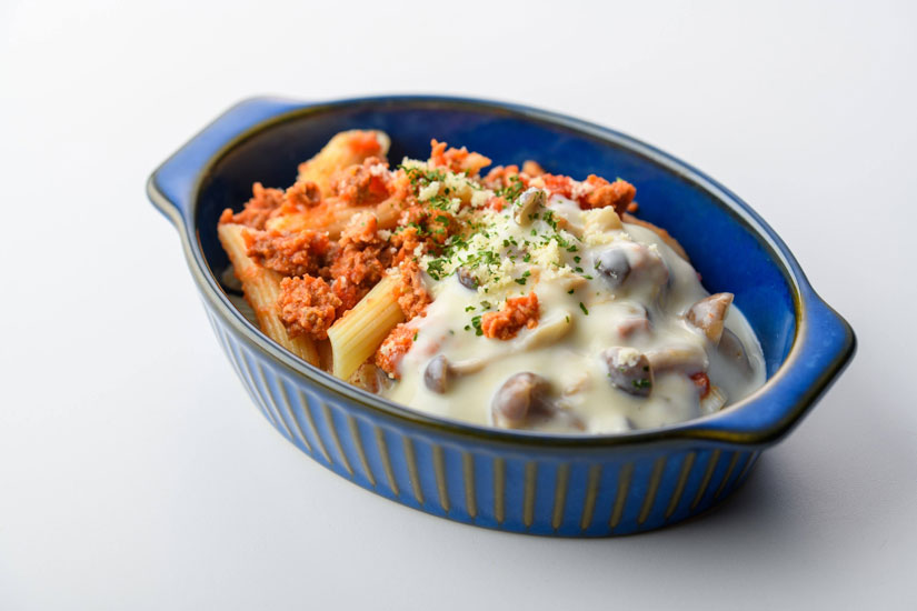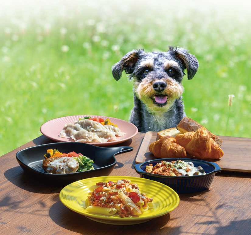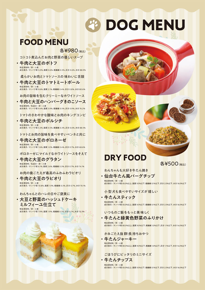 ウェットフードは、日本国内外でさまざまな賞を受賞している名店「アルケッチャーノ」の奥田政行シェフ監修。「牛肉と大豆のグラタン」(980円)や「牛肉と大豆のトマトミートボール」(980円)など塩分控えめで低脂質、”わんランクアップ”する特別メニューが揃います。ニンニクや玉ねぎはもちろん不使用。ドッグフードは持ち帰りも可能。要冷蔵。