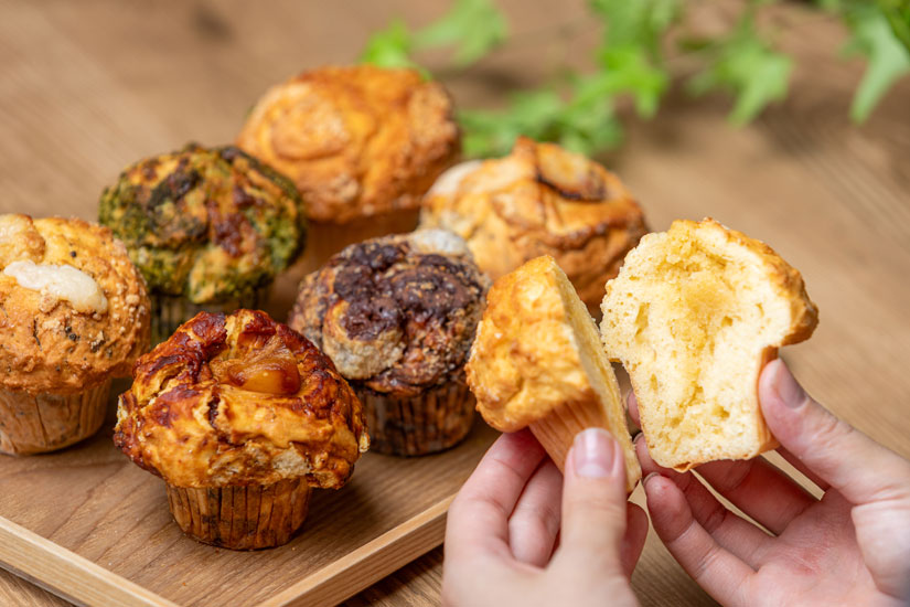 「Northsoutheastwest(ノースサウスイーストウェスト)」コラボの「マフィン」と「さくらざか栄心堂」コラボの「お団子」。