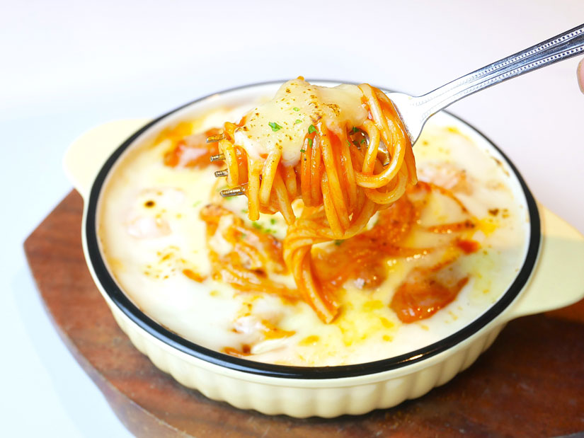 看板メニューの「わんぴーす名物スパゲッティグラタン」(1,680円)。長野県産の小麦を使用したスパゲッティに熱々トロトロのチーズがたっぷりと使われている一品です。