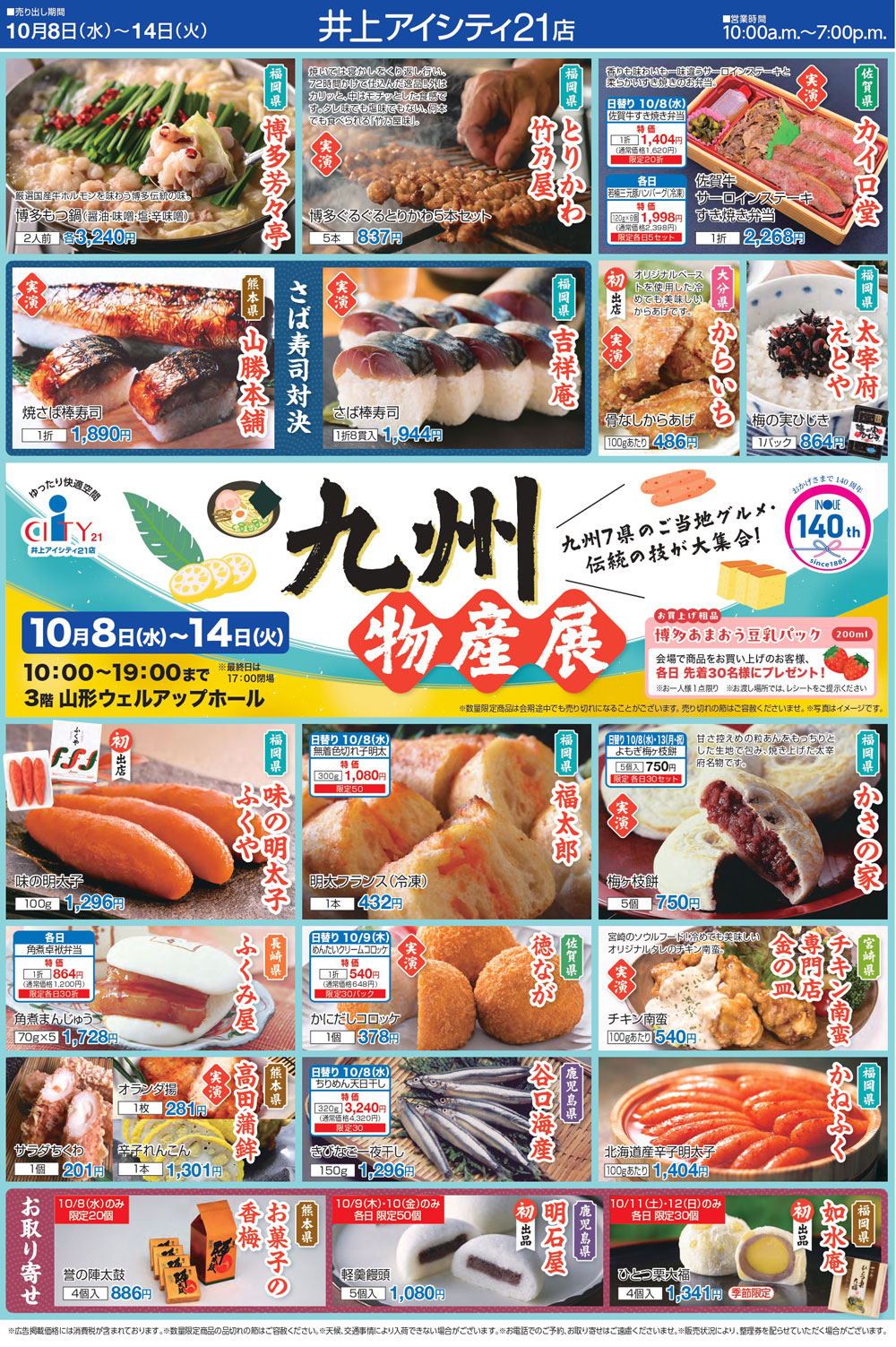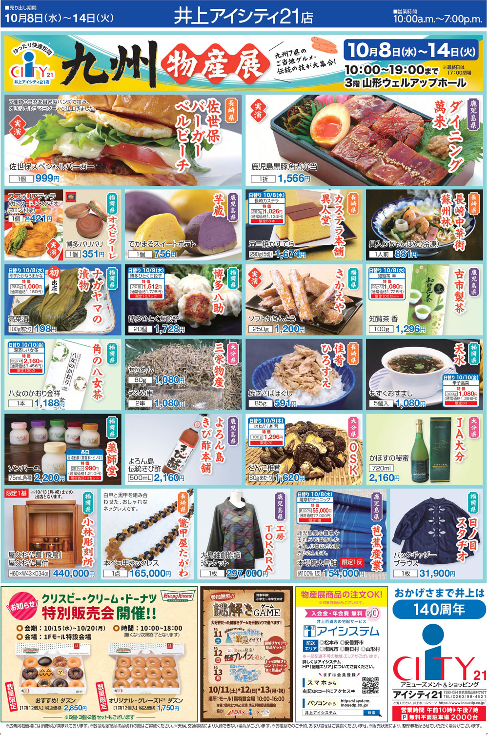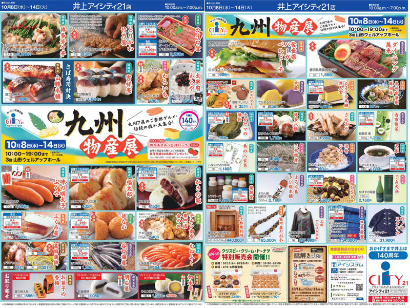 長野県の松本市「信州スカイパーク」から車で約10分。県道291号沿いにある山形村の大型複合商業施設「井上アイシティ21」で、九州7県(福岡県・佐賀県・長崎県・熊本県・大分県・宮崎県・鹿児島県)のご当地グルメなどが集結する『九州物産展』が、2025年10月8日(水)~10月14日(火・祝)にかけて開催。