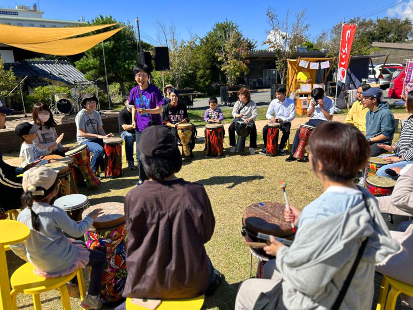 ドラムサークル。みんなで輪になってタイコをならします。誰でも参加OK。自由なリズムをみんなで分かちあいながら、即興のリズムコミュニケーションを楽しみます。