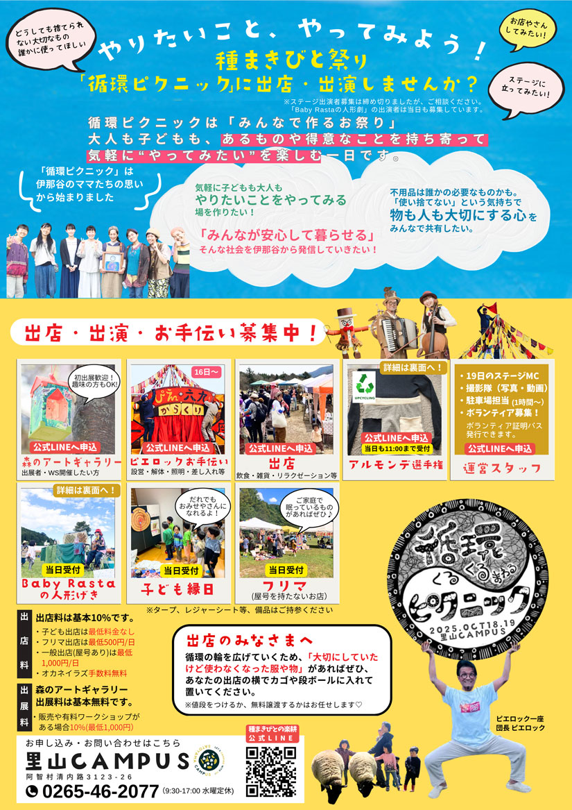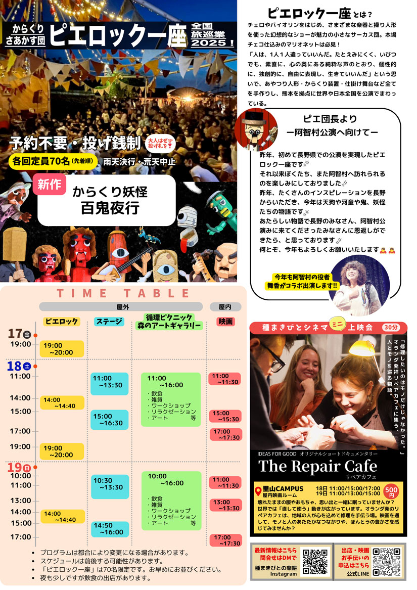 2025年10月18日(土)、10月19日(日)に、長野県長野県下伊那郡阿智村の「せいなの森キャンプ場」ほど近くの「里山CAMPUS」で『種まきびとまつり2025』が開催。入場無料の家族で楽しめる屋外イベントとして「ピエロック一座」の公演を目玉に、地元飲食店やクラフトが並ぶマルシェ&フリマ、ミニ映画上映会『リペアカフェ』、参加型ワークショップや弾き語りなどのステージまで、2日間で多彩なプログラムを展開します。
