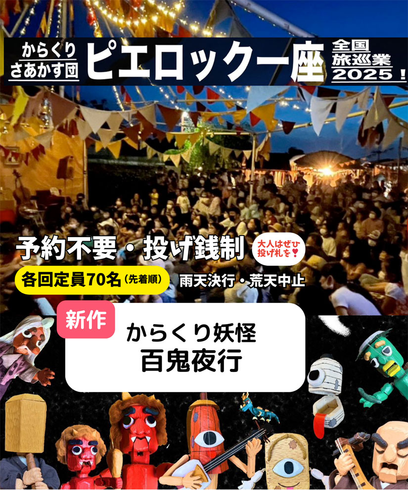 チェロやバイオリンなどのさまざまな楽器の演奏とともに本場チェコ仕込みのマリオネットによる幻想的なショーが魅力のサーカス団。操り人形をはじめ、舞台のからくり装置や仕掛けはすべて手作り。熊本を拠点に、日本から海外まで公演しているそうで、今回は新作「からくり妖怪百鬼夜行」を披露する予定です。
