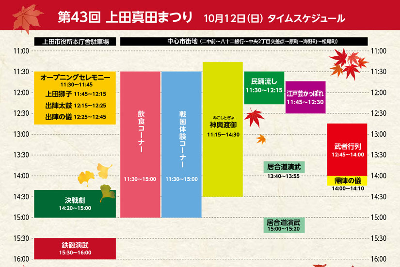 当日は11:00〜16:00まで上田城跡周辺や市役所周辺、中心市街地の広範囲で交通規制が実施されます。